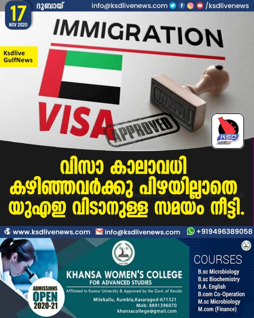 വിസാ കാലാവധി കഴിഞ്ഞവർക്കു പിഴയില്ലാതെ യുഎഇ വിടാനുള്ള സമയം നീട്ടി.