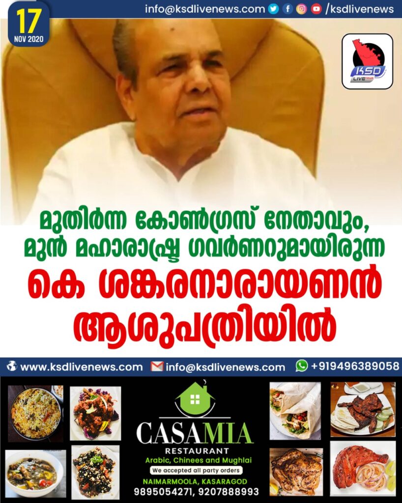 മുതിർന്ന കോൺഗ്രസ് നേതാവും, മുൻ മഹാരാഷ്ട്ര ഗവർണറുമായിരുന്ന കെ ശങ്കരനാരായണൻ ആശുപത്രിയിൽ