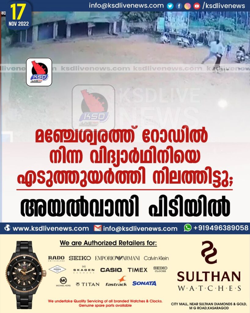 മഞ്ചേശ്വരത്ത് റോഡിൽ നിന്ന വിദ്യാർഥിനിയെ എടുത്തുയർത്തി നിലത്തിട്ടു, അയൽവാസി പിടിയിൽ