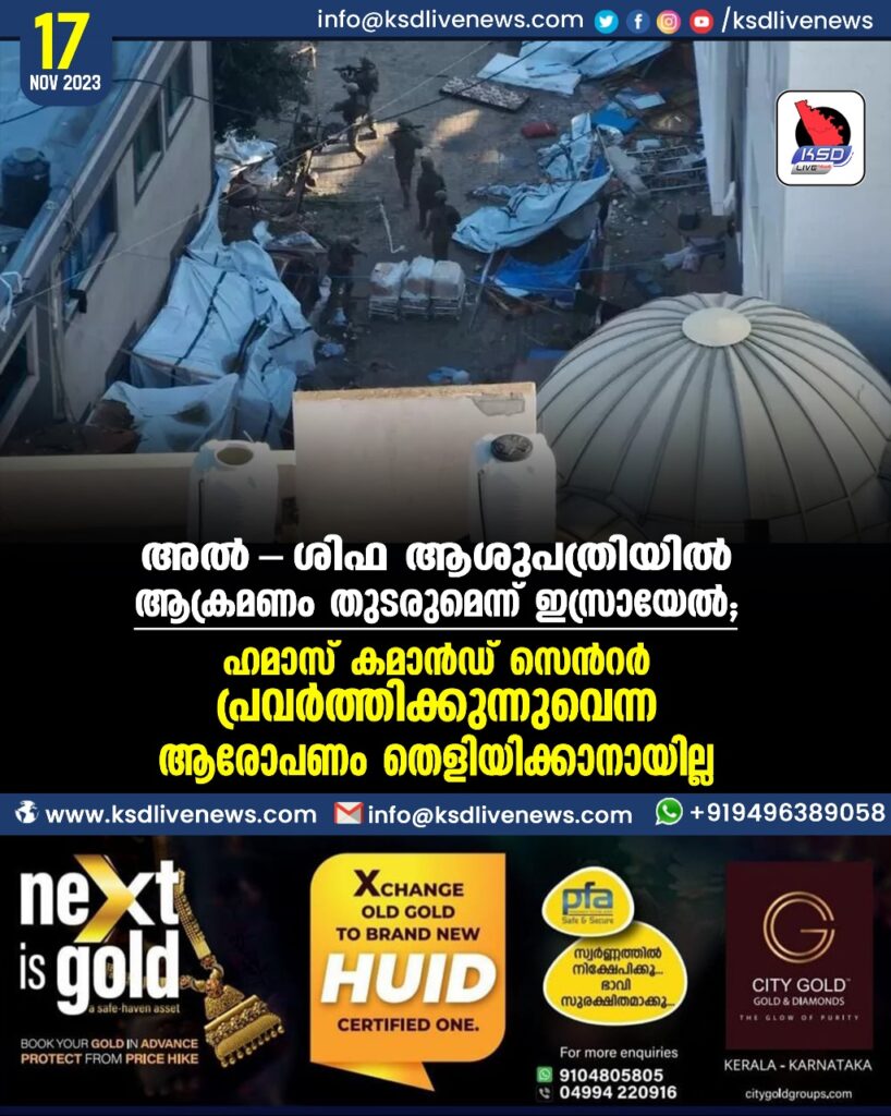 അല്‍-ശിഫ ആശുപത്രിയില്‍ ആക്രമണം തുടരുമെന്ന് ഇസ്രായേല്‍; ഹമാസ് കമാൻഡ് സെന്‍റര്‍ പ്രവര്‍ത്തിക്കുന്നുവെന്ന ആരോപണം തെളിയിക്കാനായില്ല