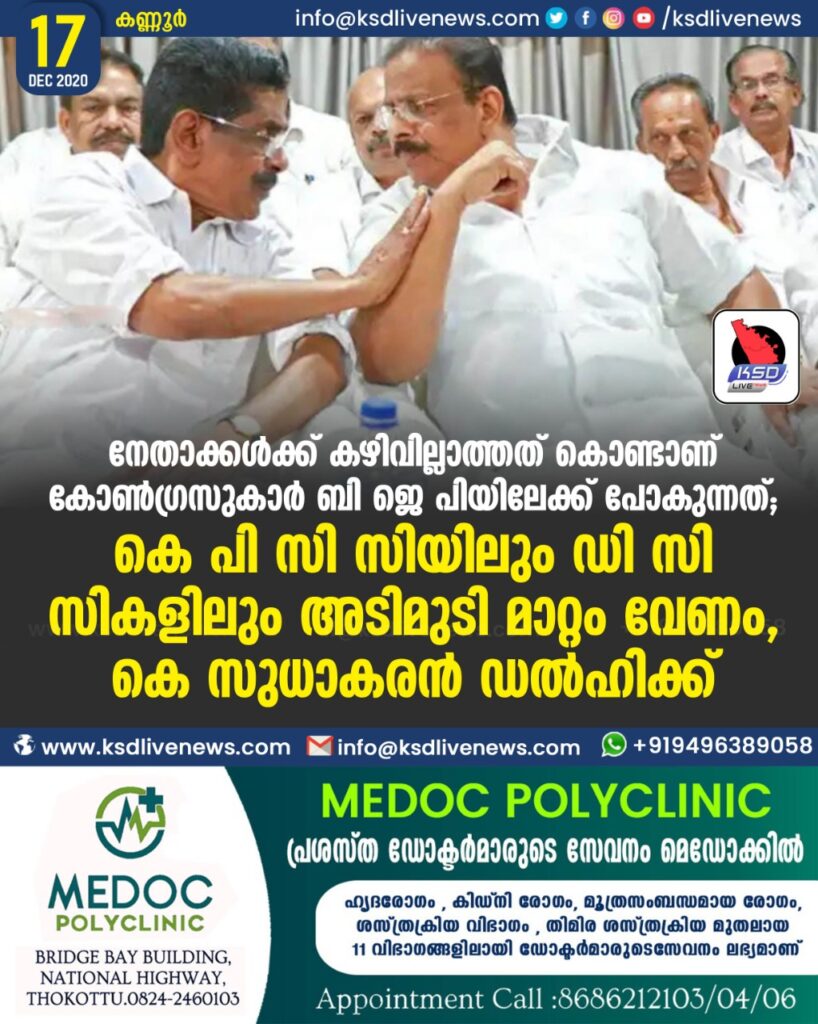 നേതാക്കൾക്ക് കഴിവില്ലാത്തത് കൊണ്ടാണ് കോൺഗ്രസുകാർ ബി ജെ പിയിലേക്ക് പോകുന്നത് ; കെ പി സി സിയിലും ഡി സി സികളിലും അടിമുടി മാറ്റം വേണം , കെ സുധാകരൻ ഡൽഹിക്ക്