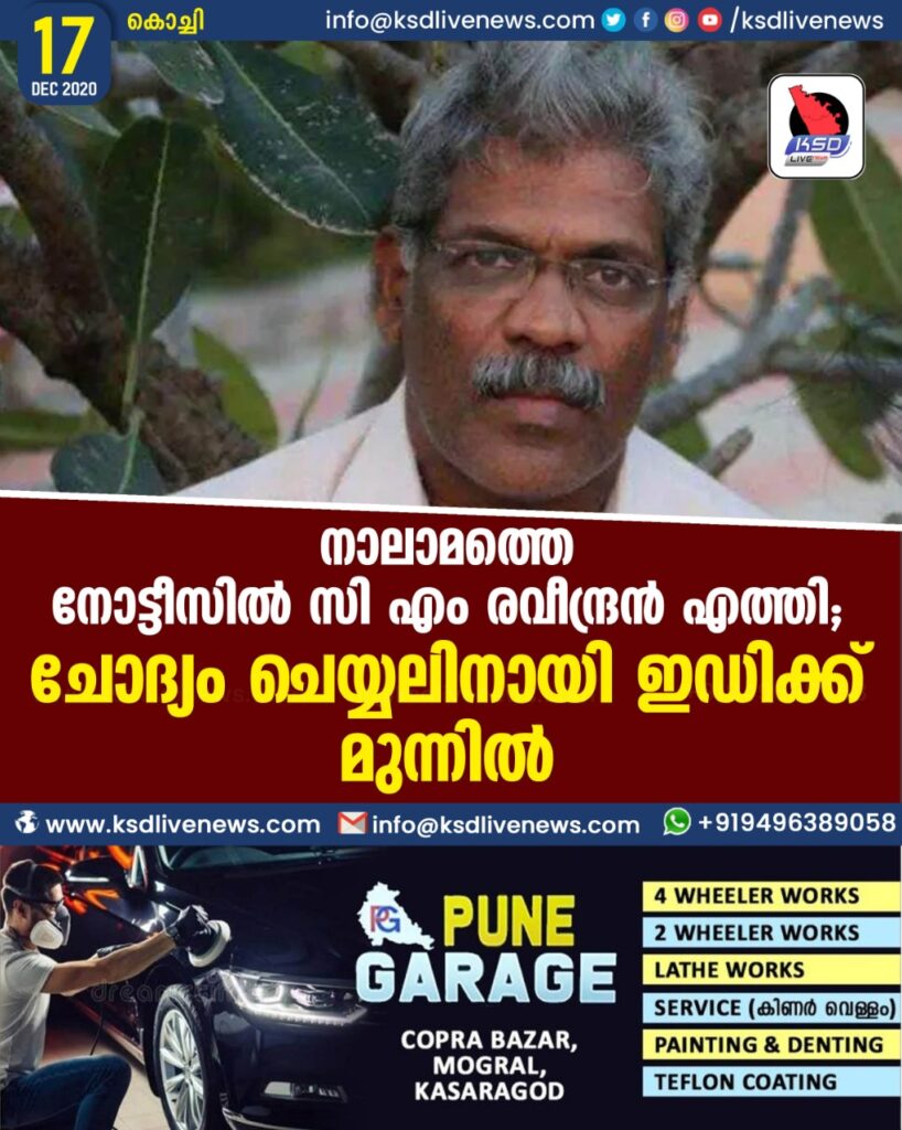 നാലാമത്തെ നോട്ടീസിൽ സി എം രവീന്ദ്രൻ എത്തി ; ചോദ്യം ചെയ്യലിനായി ഇഡിക്ക് മുന്നിൽ