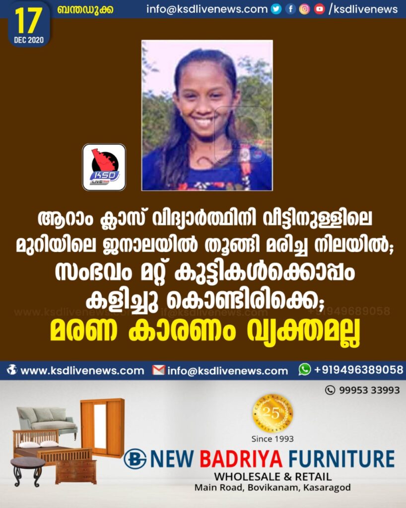 ആറാം ക്ലാസ് വിദ്യാർത്ഥിനി വീട്ടിനുള്ളിലെ മുറിയിലെ ജനാലയിൽ തൂങ്ങി മരിച്ച നിലയിൽ; സംഭവം മറ്റ് കുട്ടികൾക്കൊപ്പം കളിച്ചു കൊണ്ടിരിക്കെ; മരണ കാരണം വ്യക്തമല്ല