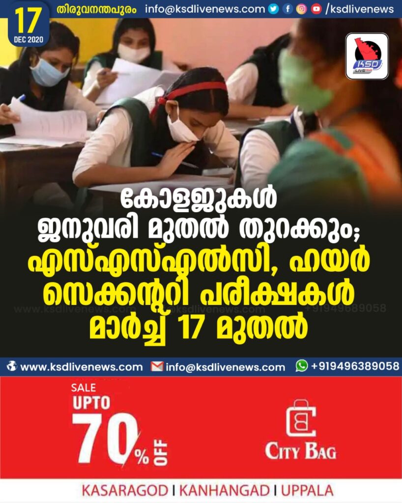 കോളജുകൾ ജനുവരി മുതൽ തുറക്കും ; എസ്എസ്എൽസി , ഹയർ സെക്കന്ററി പരീക്ഷകൾ മാർച്ച് 17 മുതൽ