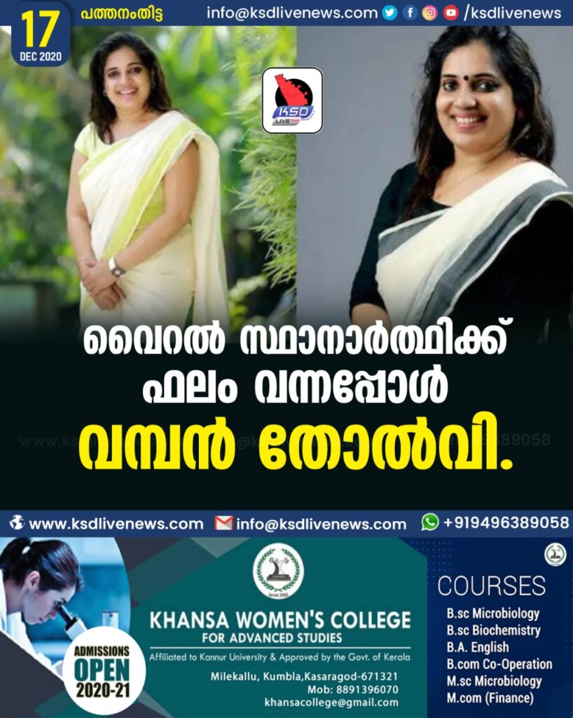 പത്തനംതിട്ട: കൊവിഡ് കാലത്തെ തിരഞ്ഞെടുപ്പ് പ്രചാരണം സമൂഹമാദ്ധ്യമങ്ങള് ഏറ്റടുത്തപ്പോള് വൈറലായ സ്ഥാനാര്ഥികള് നിരവധിയാണ്. അക്കൂട്ടത്തില് ഒരാളായിരുന്ന പത്തനംതിട്ട മല്ലപ്പള്ളി ഡിവിഷനിലെ യുഡിഎഫ് സ്ഥാനാര്ഥി അഡ്വ. വിബിത ബാബു. വ്യത്യസ്തമായ ഫോട്ടോഷൂട്ടിലൂടെ സ്ഥാനാര്ഥിയായിരുന്ന സമയത്ത് വിബിതയുടെ ചിത്രങ്ങള് സോഷ്യല് മീഡിയയില് വൈറലായിരുന്നു.എന്നാല് ഫലം പുറത്തു വന്നപ്പോള് പരാജയപ്പെട്ടു. എല്ഡിഎഫ് സ്ഥാനാര്ഥി സി.കെ. ലതാകുമാരിയാണ് മല്ലപ്പള്ളി ഡിവിഷനില് വിജയിച്ചത്.