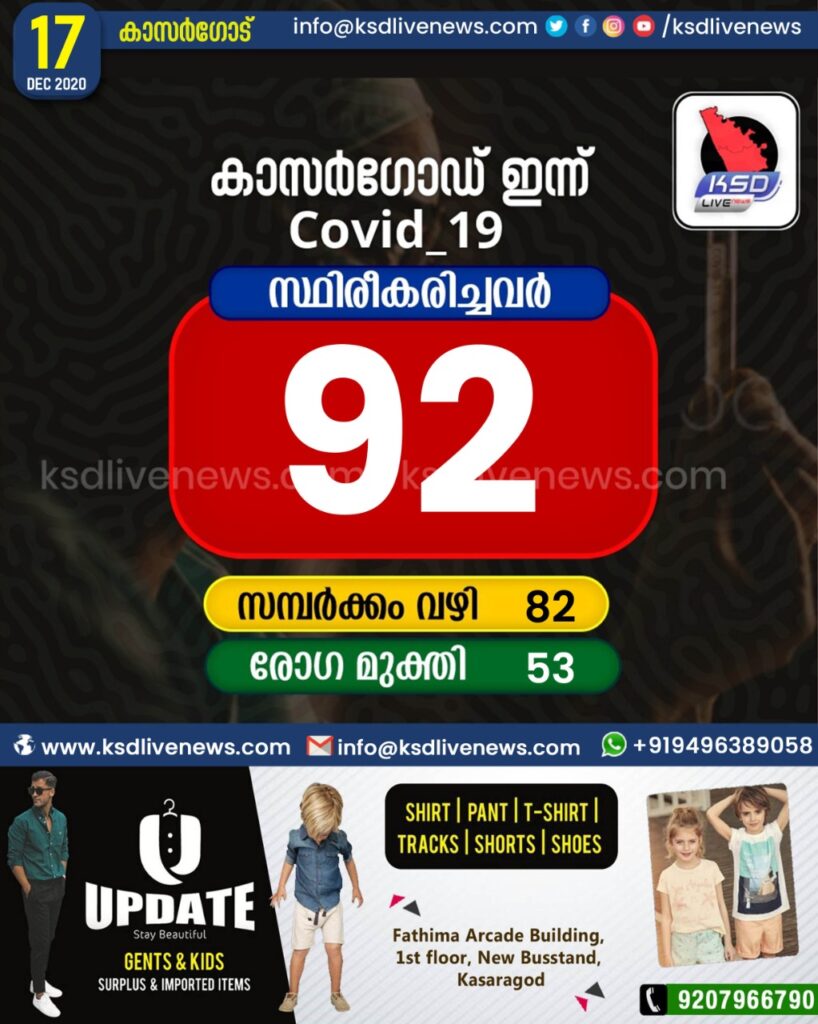 കാസര്കോട് ജില്ലയില് 92 പേര്ക്ക് കോവിഡ്, 53 പേര്ക്ക് രോഗമുക്തി