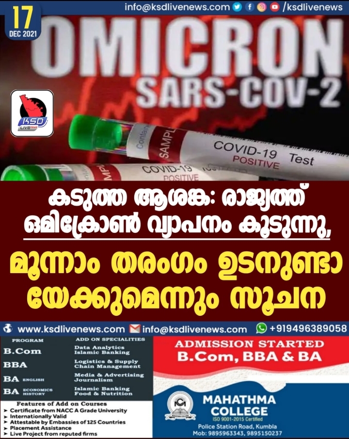 കടുത്ത ആശങ്ക: രാജ്യത്ത് ഒമിക്രോണ് വ്യാപനം കൂടുന്നു, മൂന്നാം തരംഗം ഉടനുണ്ടായേക്കുമെന്നും സൂചന