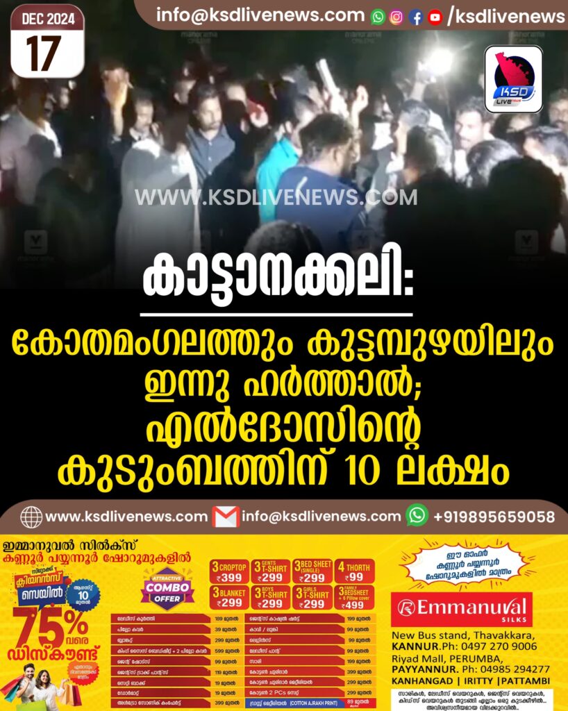 കാട്ടാനക്കലി: കോതമംഗലത്തും കുട്ടമ്പുഴയിലും ഇന്നു ഹർത്താൽ; എൽദോസിന്റെ കുടുംബത്തിന് 10 ലക്ഷം