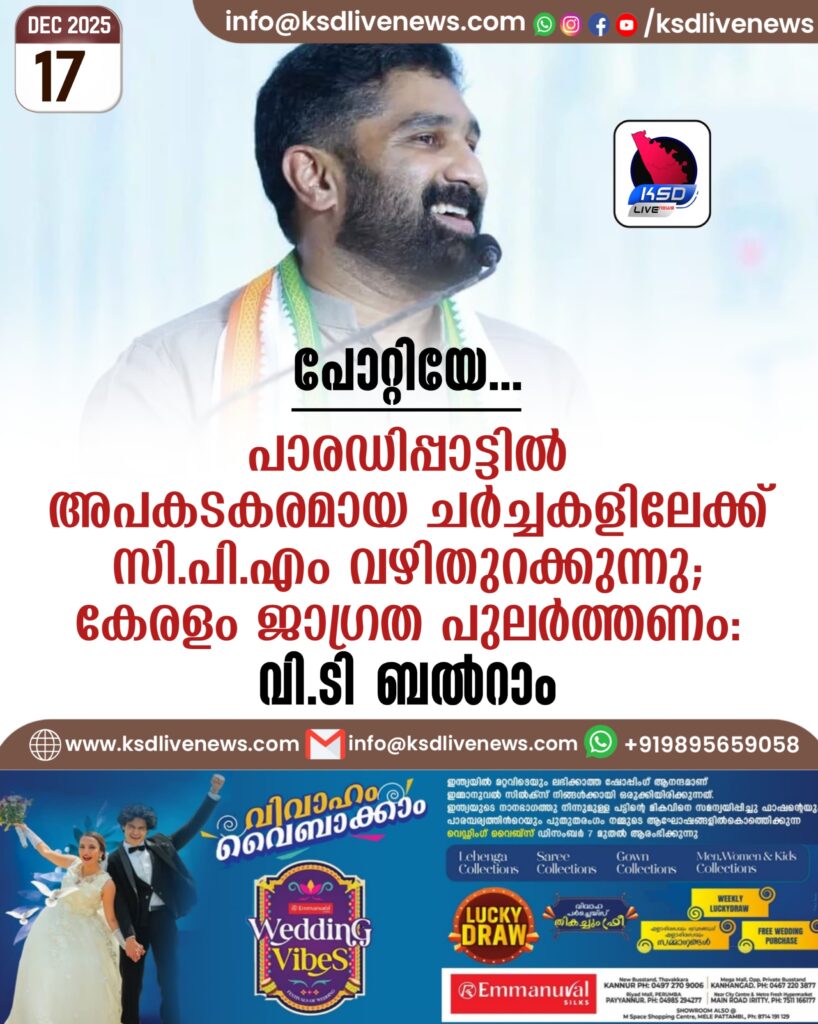 പോറ്റിയേ…’ പാരഡിപ്പാട്ടിൽ അപകടകരമായ ചർച്ചകളിലേക്ക് സി.പി.എം വഴിതുറക്കുന്നു; കേരളം ജാഗ്രത പുലർത്തണം: വി.ടി ബൽറാം