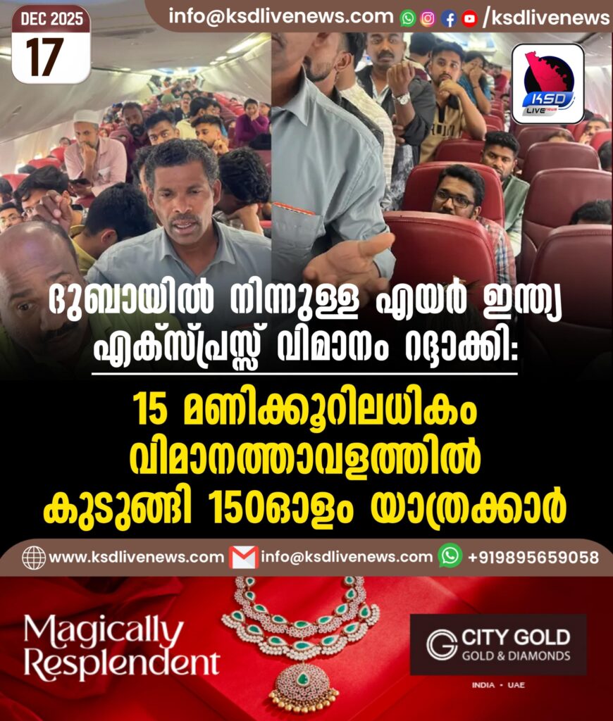 ദുബായിൽ നിന്നുള്ള എയർ ഇന്ത്യ എക്സ്പ്രസ്സ് വിമാനം റദ്ദാക്കി: 15 മണിക്കൂറിലധികം വിമാനത്താവളത്തിൽ കുടുങ്ങി 150ഓളം യാത്രക്കാർ