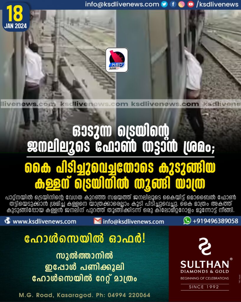 ഓടുന്ന ട്രെയിന്റെ ജനലിലൂടെ ഫോണ്‍ തട്ടാൻ ശ്രമം; കൈ പിടിച്ചുവെച്ചതോടെ കുടുങ്ങിയ കള്ളന് ട്രെയിനില്‍ തൂങ്ങി യാത്ര