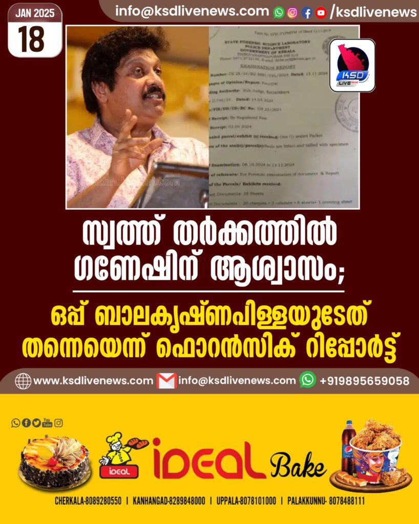 സ്വത്ത് തർക്കത്തിൽ ഗണേഷിന് ആശ്വാസം; ഒപ്പ് ബാലകൃഷ്ണപിള്ളയുടേത് തന്നെയെന്ന് ഫൊറൻസിക് റിപ്പോർട്ട്