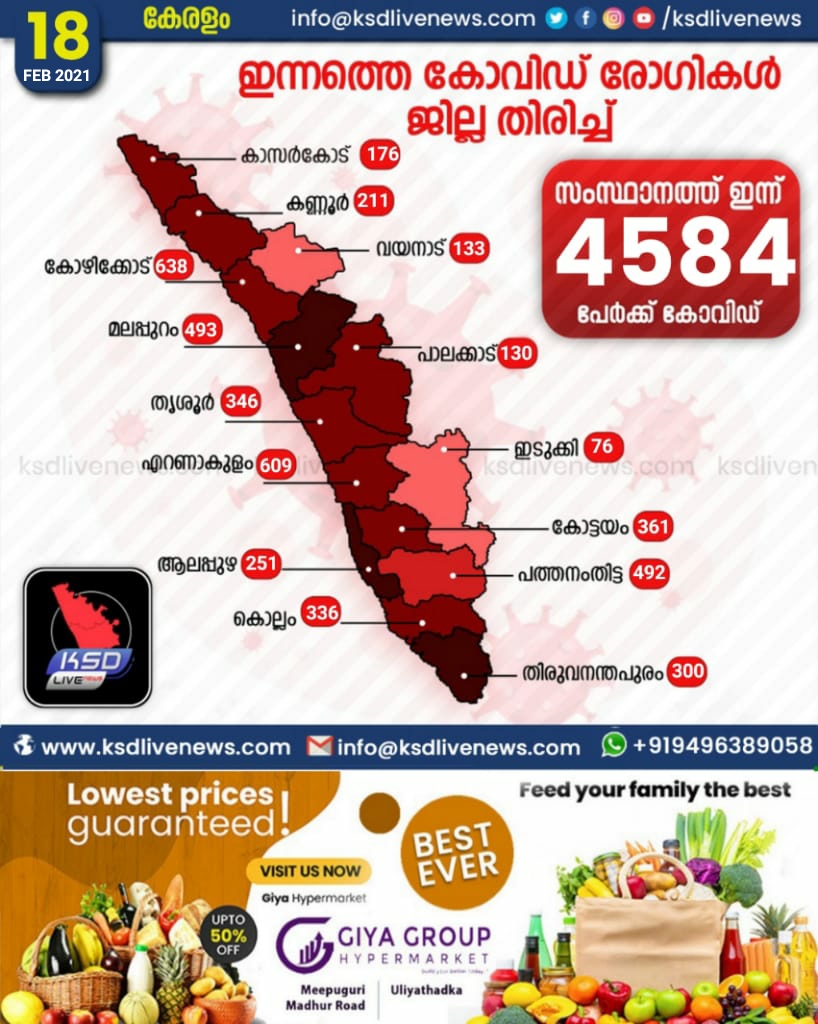 സംസ്ഥാനത്ത് ഇന്ന് 4584 പേര്‍ക്ക് കോവിഡ്-19 സ്ഥിരീകരിച്ചു. കോഴിക്കോട് 638, എറണാകുളം 609, മലപ്പുറം 493, പത്തനംതിട്ട 492, കൊല്ലം 366, കോട്ടയം 361, തൃശൂര്‍ 346, തിരുവനന്തപുരം 300, ആലപ്പുഴ 251, കണ്ണൂര്‍ 211, കാസര്‍ഗോഡ് 176, വയനാട് 133, പാലക്കാട് 130, ഇടുക്കി 78 എന്നിങ്ങനേയാണ് ജില്ലകളില്‍ ഇന്ന് രോഗ ബാധ സ്ഥിരീകരിച്ചത്.