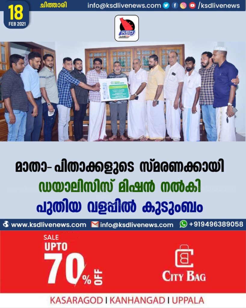 മാതാപിതാക്കളുടെ സമരണകായി ഡയാലിസിസ് മിഷൻ നൽകി പുതിയ വളപ്പിൽ കുടുംബം