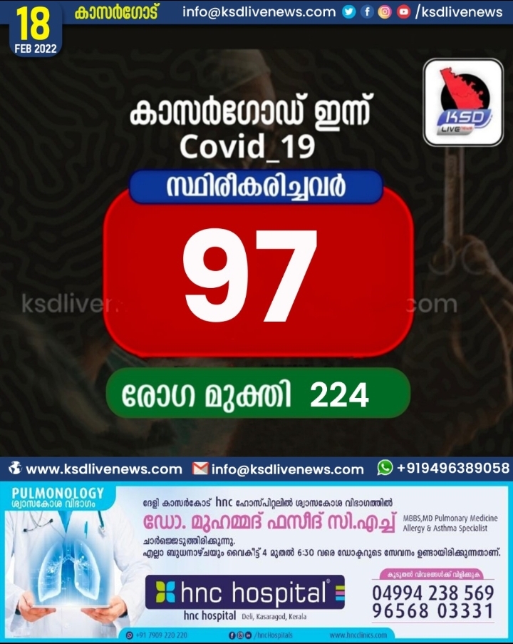കാസര്കോട് ജില്ലയിൽ 97 പേർ കൂടി കോവിഡ്-19 പോസിറ്റീവായി. ചികിത്സയിലുണ്ടായിരുന്ന 224