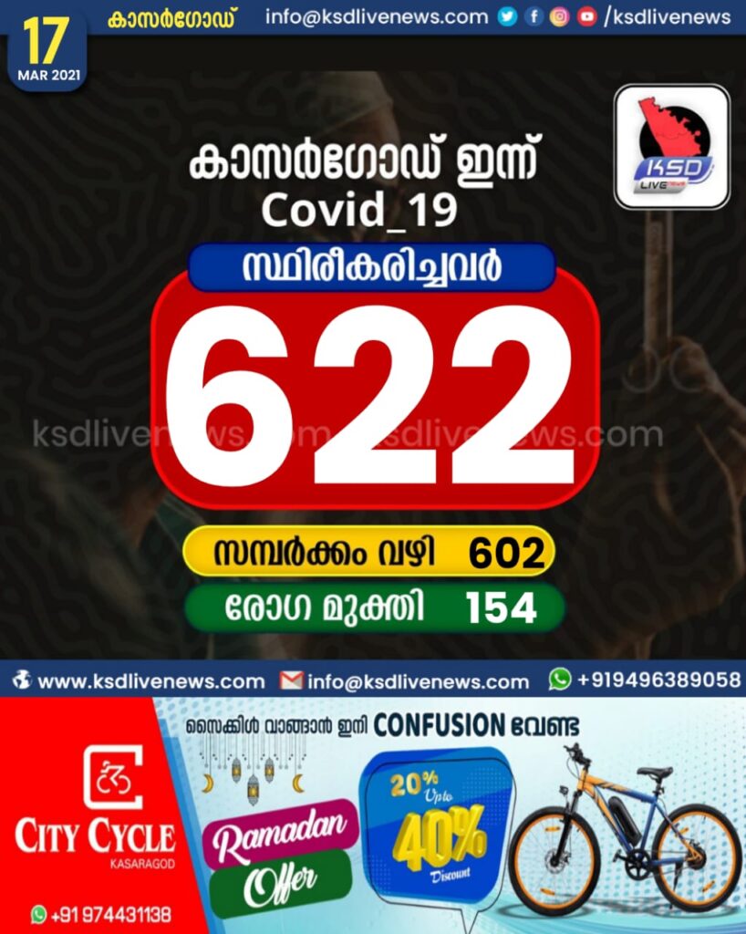 കാസർഗോഡ് ജില്ലയിൽ ഇന്ന് 622 പേർക്ക് കോവിഡ് സ്ഥിരീകരിച്ചു. സമ്പർക്കം വഴി 602 പേർക്കും. 154 പേർക്ക് രോഗമുക്തിSHARE THIS ONകാസർഗോഡ് ജില്ലയിൽ ഇന്ന് 622 പേർക്ക് കോവിഡ് സ്ഥിരീകരിച്ചു. സമ്പർക്കം വഴി 602 പേർക്കും. 154 പേർക്ക് രോഗമുക്തി