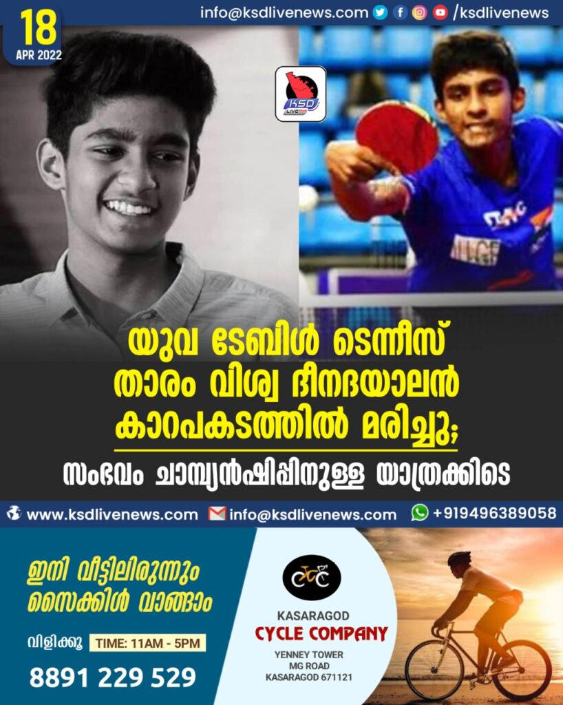 യുവ ടേബിൾ ടെന്നീസ് താരം വിശ്വ ദീനദയാലൻ കാറപകടത്തിൽ മരിച്ചു; സംഭവം ചാമ്പ്യൻഷിപ്പിനുള്ള യാത്രക്കിടെ