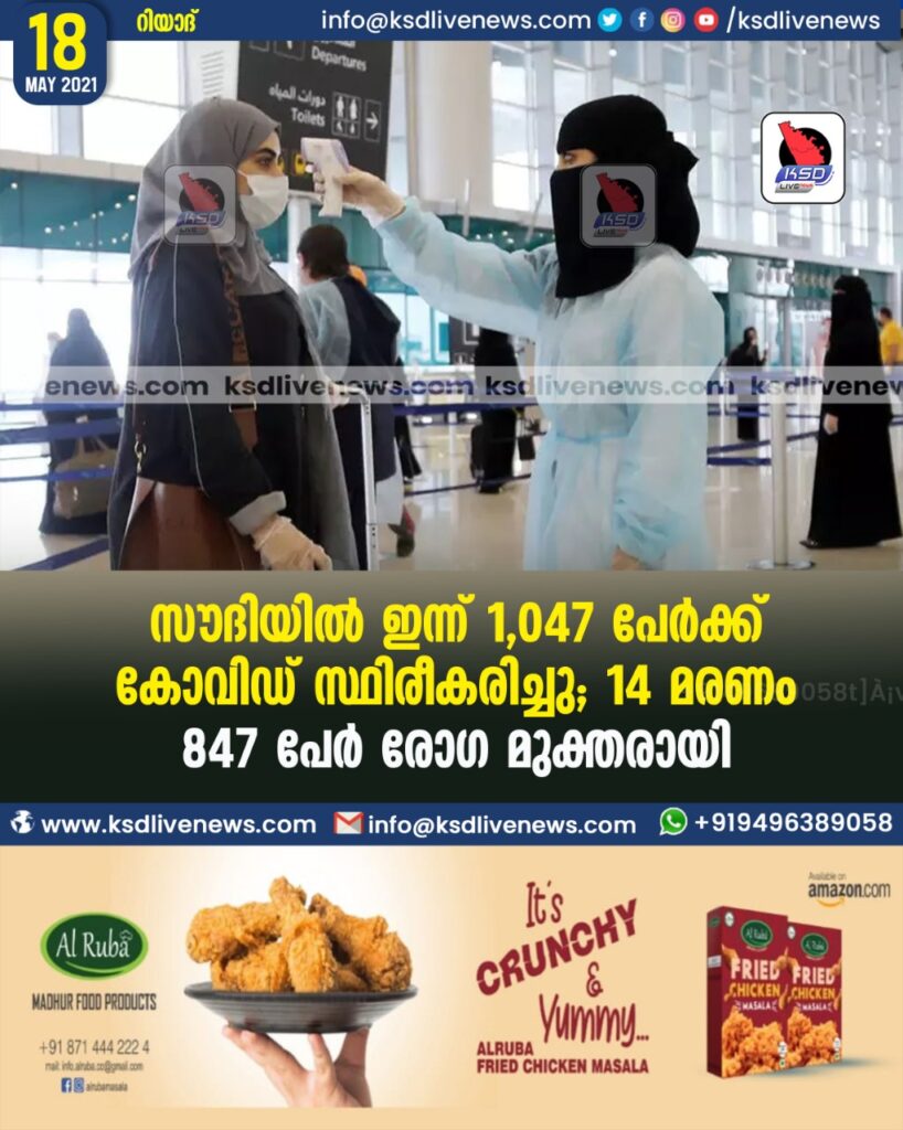 സൗദിയിൽ ഇന്ന് 1,047 പേർക്ക് കോവിഡ് സ്ഥിരീകരിച്ചു; 14 മരണം 847 പേർ രോഗ മുക്തരായി