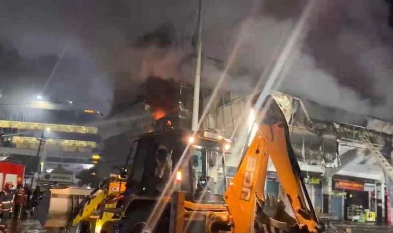 നാല് മണിക്കൂറായിട്ടും തീയണയ്ക്കാനായില്ല, ചില്ല് പൊട്ടിക്കാൻ ജെ.സി.ബിയും രംഗത്ത്, നഗരം സ്തംഭിച്ചു