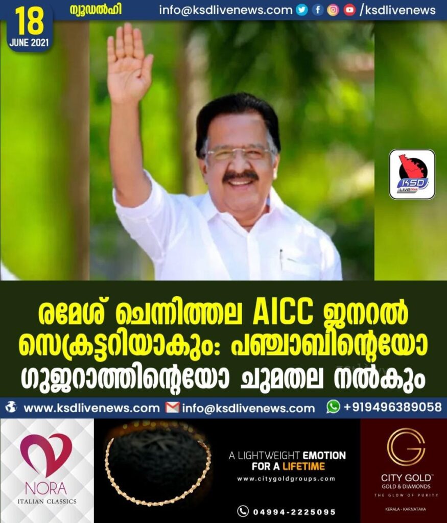 രമേശ് ചെന്നിത്തല AICC ജനറല്‍ സെക്രട്ടറിയാകും: പഞ്ചാബിന്റെയോ ഗുജറാത്തിന്റെയോ ചുമതല നല്‍കും