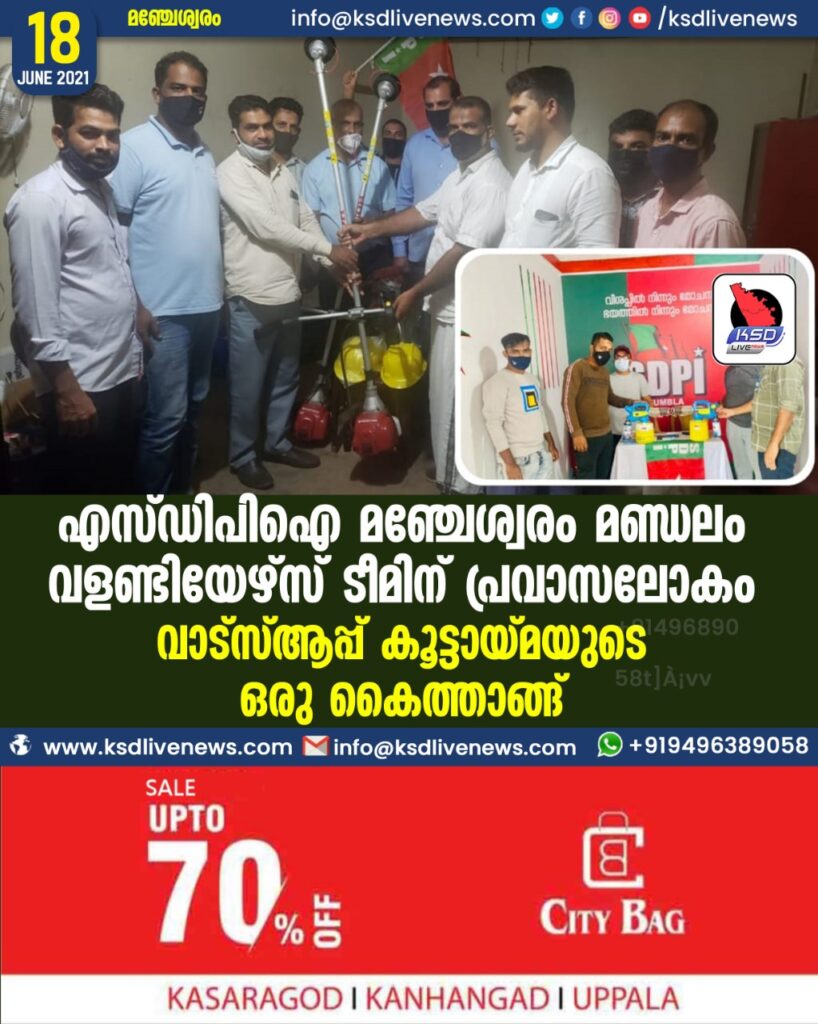 മഞ്ചേശ്വരം : ഈ ലോക്ക് ഡൗൺ കാലയളവിലും പ്രശംസനീയവും മാതൃകാപരവുമായ സേവന പ്രവർത്തനങ്ങൾക്ക് നേതൃത്വം നൽകുന്ന എസ്ഡിപിഐ മഞ്ചേശ്വരം മണ്ഡലം കമ്മിറ്റിക്ക് മഞ്ചേശ്വരം പ്രവാസലോകം വാട്സ്ആപ്പ് കൂട്ടായ്മയുടെ സ്നേഹ ഉപഹാരമായി നൽകിയ ഗ്രാസ്കട്ടിങ് യന്ത്രവും ഫോഗ് മിഷനും എസ്ഡിപിഐ ജില്ലാ പ്രസിഡണ്ട്: ഇഖ്ബാൽ ഹൊസങ്കടി, എസ്ഡിപിഐ മഞ്ചേശ്വരം മണ്ഡലം പ്രസിഡണ്ട് അൻസാർ ഹോസംഘടിക് കൈമാറി…
