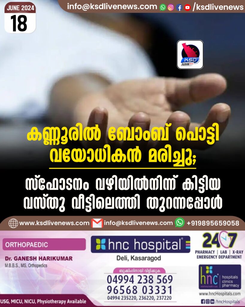 കണ്ണൂരിൽ ബോംബ് പൊട്ടി വയോധികൻ മരിച്ചു; സ്ഫോടനം വഴിയിൽനിന്ന് കിട്ടിയ വസ്തു വീട്ടിലെത്തി തുറന്നപ്പോൾ