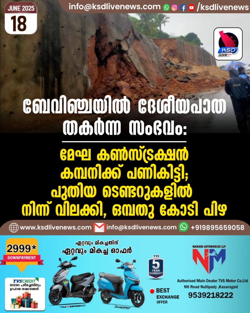 ബേവിഞ്ചയിൽ ദേശീയപാത തകര്‍ന്ന സംഭവം; മേഘ കൺസ്ട്രക്ഷൻ കമ്പനിക്ക് പണികിട്ടി, പുതിയ ടെണ്ടറുകളിൽ നിന്ന് വിലക്കി, ഒമ്പതു കോടി പിഴ