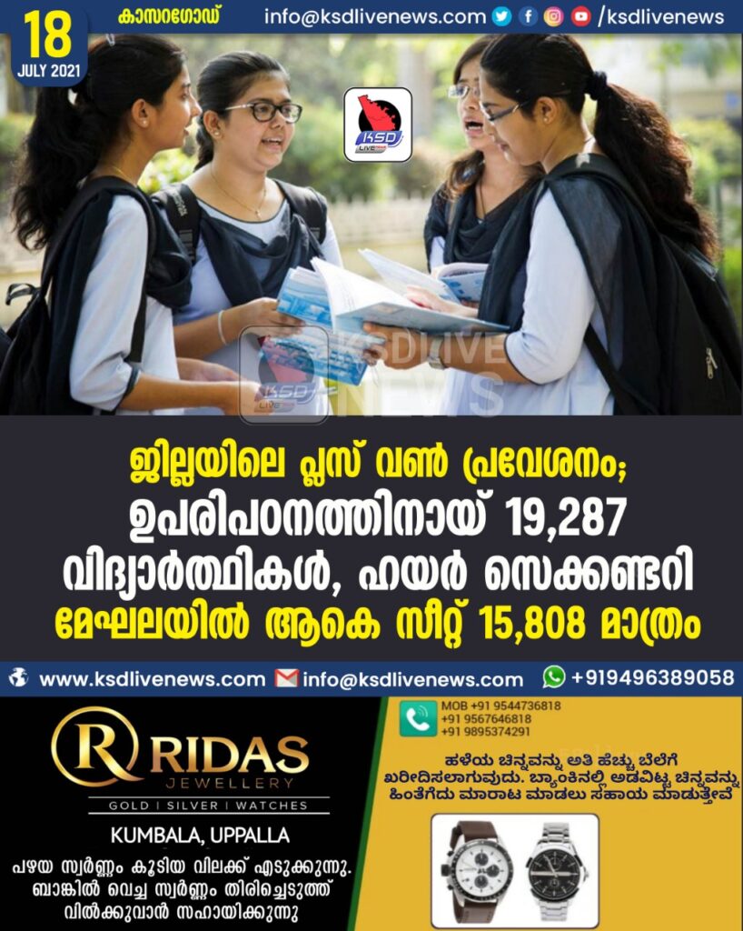 ജില്ലയിലെ പ്ലസ് വൺ പ്രവേശനം : ഉപരിപഠനത്തിനായ് 19,287 വിദ്യാർത്ഥികൾ, ഹയർ സെക്കണ്ടറി മേഘലയിൽ ആകെ സീറ്റ് 15,808 മാത്രം