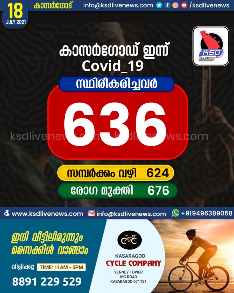 കാസർഗോഡ് ജില്ലയിൽ ഇന്ന് 636 പേർക്ക് കോവിഡ് സ്ഥിരീകരിച്ചു. സമ്പർക്കം വഴി 624 പേർക്കും. 676 പേർക്ക് രോഗമുക്തി