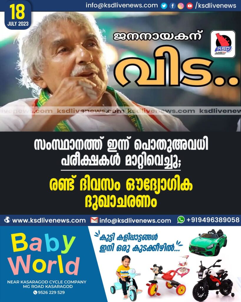 സംസ്ഥാനത്ത് ഇന്ന് പൊതുഅവധി, പരീക്ഷകൾ മാറ്റിവെച്ചു; രണ്ട് ദിവസം ഔദ്യോഗിക ദുഖാചരണം