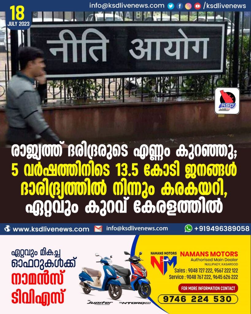 രാജ്യത്ത് ദരിദ്രരുടെ എണ്ണം കുറഞ്ഞു; 5 വര്ഷത്തിനിടെ 13.5 കോടി ജനങ്ങള് ദാരിദ്ര്യത്തില് നിന്നും കരകയറി, ഏറ്റവും കുറവ് കേരളത്തില്