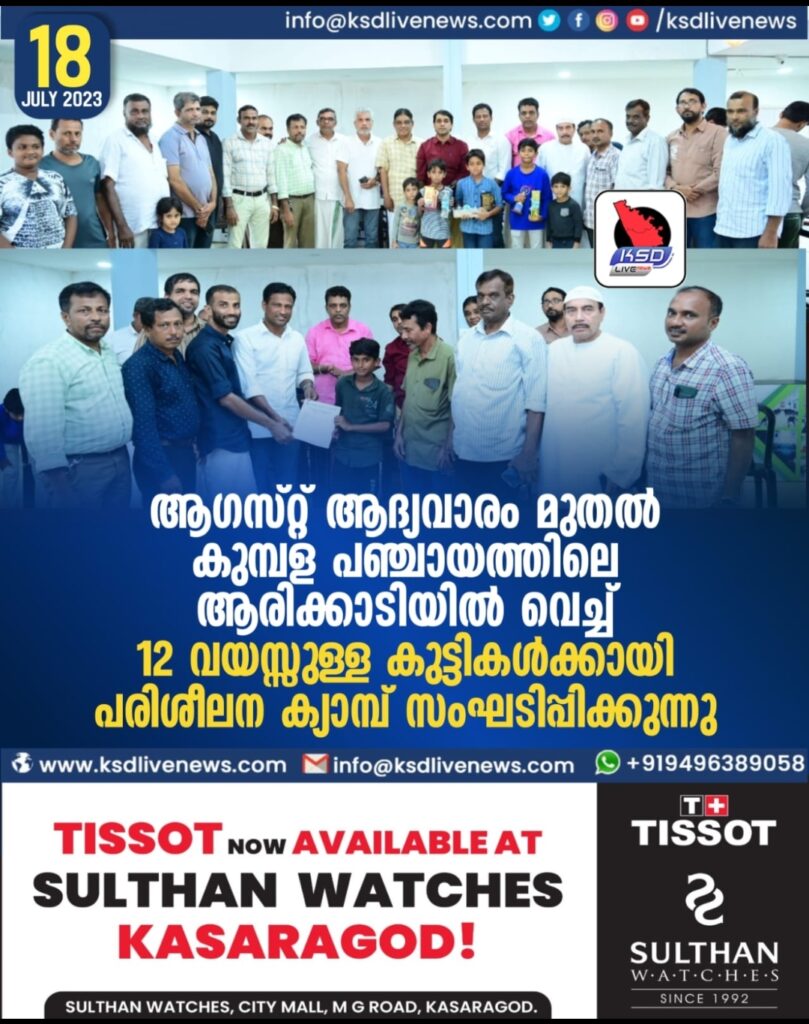 ആഗസ്റ്റ് ആദ്യവാരം മുതൽ കുമ്പള പഞ്ചായത്തിലെ ആരിക്കാടിയിൽ വെച്ച് 12 വയസ്സുള്ള കുട്ടികൾക്കായി പരിശീലന ക്യാമ്പ് സംഘടിപ്പിക്കുന്നു