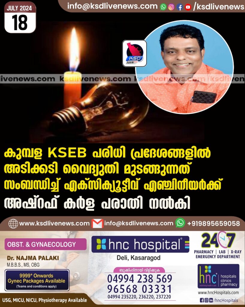 കുമ്പള KSEB പരിധി പ്രദേശങ്ങളിൽ അടിക്കടി വൈദ്യുതി മുടങ്ങുന്നത് സംബന്ധിച്ച് എക്സിക്യൂട്ടീവ് എഞ്ചിനീയർക്ക് അഷ്റഫ് കർള പരാതി നൽകി