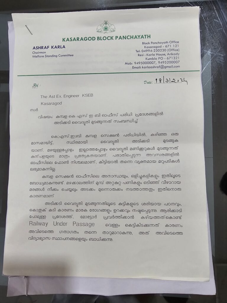 വൈദ്യുതി ലൈനുകളിൽ അറ്റകുറ്റ പണി നടത്തേണ്ട സമയത്ത് അത് ചെയ്യാതെയും , സ്വയ സുരക്ഷയുടെ പേരിലും മറ്റും മുടക്കുന്നതിനെ പറ്റി അന്യോഷണം നടത്തി പരിഹാരം കാണണമെന്നും മറ്റും ആവശ്യപ്പെട്ടു കൊണ്ട് കാസറഗോഡ് ബ്ലോക്ക് പഞ്ചായത്ത് സ്റ്റാൻഡിംഗ് കമ്മിറ്റി ചെയർമാൻ അഷ്റഫ് കർള കാസറഗോഡ് അസിസ്റ്റന്റ് എഞ്ചിനീയർക്ക് പരാതി നൽകി.