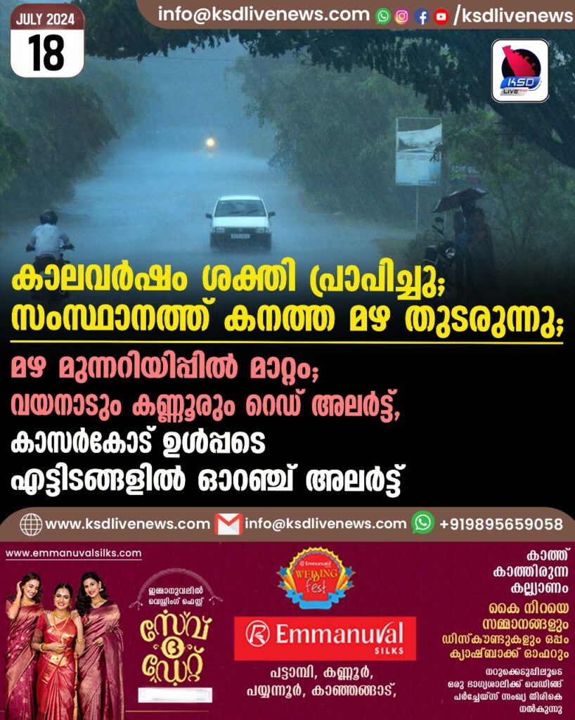 കാലവർഷം ശക്തി പ്രാപിച്ചു; സംസ്ഥാനത്ത് കനത്ത മഴ തുടരുന്നു; മഴ മുന്നറിയിപ്പിൽ മാറ്റം; വയനാടും കണ്ണൂരും റെഡ് അലർട്ട്, കാസർകോട് ഉൾപ്പടെ എട്ടിടങ്ങളിൽ ഓറഞ്ച് അലർട്ട്