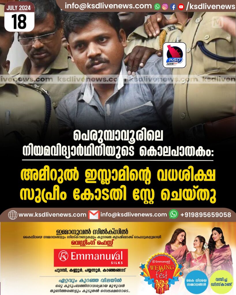 പെരുമ്പാവൂരിലെ നിയമവിദ്യാർഥിനിയുടെ കൊലപാതകം: അമീറുൽ ഇസ്ലാമിന്റെ വധശിക്ഷ സുപ്രീം കോടതി സ്റ്റേ ചെയ്തു