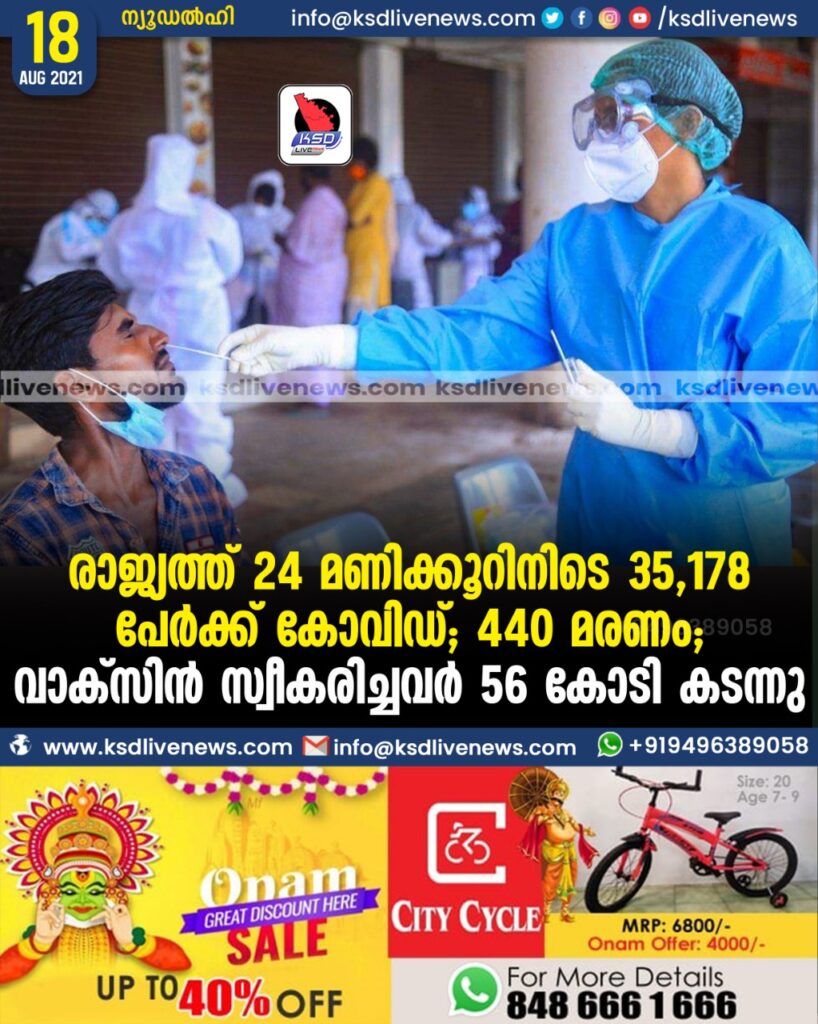 രാജ്യത്ത് 24 മണിക്കൂറിനിടെ 35,178 പേർക്ക് കോവിഡ്; 440 മരണം; വാക്സിൻ സ്വീകരിച്ചവർ 56 കോടി കടന്നു