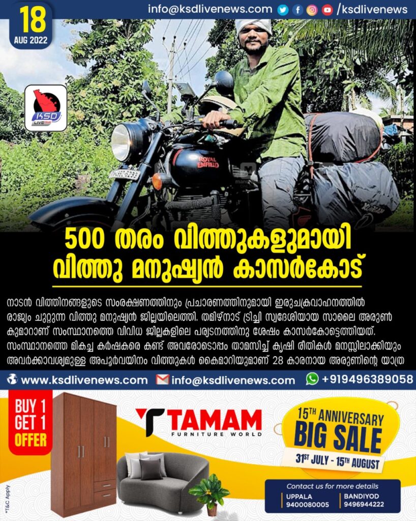 പെരിയ ∙ നാടൻ വിത്തിനങ്ങളുടെ സംരക്ഷണത്തിനും പ്രചാരണത്തിനുമായി ഇരുചക്രവാഹനത്തിൽ രാജ്യം ചുറ്റുന്ന ‘വിത്തു മനുഷ്യൻ’ ജില്ലയിലെത്തി. തമിഴ്നാട് ട്രിച്ചി സ്വദേശിയായ സാലൈ അരുൺകുമാറാണ് സംസ്ഥാനത്തെ വിവിധ ജില്ലകളിലെ പര്യടനത്തിനു ശേഷം കാസർകോട്ടെത്തിയത്. സംസ്ഥാനത്തെ മികച്ച കർഷകരെ കണ്ട് അവരോടൊപ്പം താമസിച്ച് കൃഷി രീതികൾ മനസ്സിലാക്കിയും അവർക്കാവശ്യമുള്ള അപൂർവയിനം വിത്തുകൾ കൈമാറിയുമാണ് 28 കാരനായ അരുണിന്റെ യാത്ര. 500 ലേറെ വിത്തുകളുടെ ശേഖരം അരുൺകുമാറിന്റെ കൈവശമുണ്ട്.