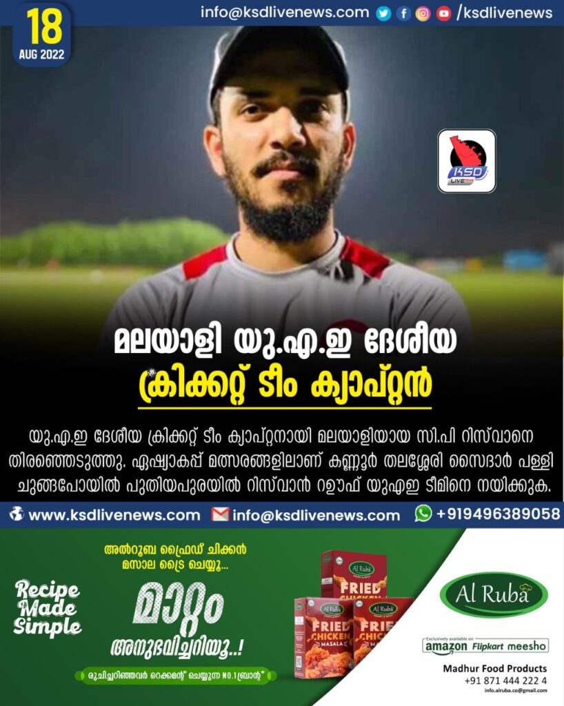 ദുബൈ: യു.എ.ഇ ദേശീയ ക്രിക്കറ്റ് ടീം ക്യാപ്റ്റനായി മലയാളിയായ സി.പി റിസ്വാനെ തിരഞ്ഞെടുത്തു. ഏഷ്യാകപ്പ് മത്സരങ്ങളിലാണ് കണ്ണൂര് തലശ്ശേരി സൈദാര് പള്ളി ചുണ്ടങ്ങപോയില് പുതിയപുരയില് റിസ്വാന് റഊഫ് യുഎഇ ടീമിനെ നയിക്കുക. യു.എ.ഇ ദേശീയ ടീമിന്റെ ചരിത്രത്തില് ആദ്യമായാണ് ഒരു മലയാളി നായകനാകുന്നത്. ശനിയാഴ്ച മുതല് ഒമാനില് നടക്കുന്ന ഏഷ്യാകപ്പ് യോഗ്യത മത്സരത്തില് റിസ്വാന് യു.എ.ഇയെ നയിക്കും. യോഗ്യത നേടിയാല് ആഗസ്റ്റ് 27ന് ആരംഭിക്കുന്ന ഏഷ്യാകപ്പില് ഇന്ത്യ, പാകിസ്താന് ടീമുകള്ക്കെതിരെ യു.എ.ഇക്ക് മത്സരിക്കാന് കഴിയും. റിസ്വാന് പുറമെ മലയാളി താരങ്ങളായ ബാസില് ഹമീദ്, അലിഷാന് ഷറഫു എന്നിവരും ടീമില് ഇടം നേടിയിട്ടുണ്ട്.