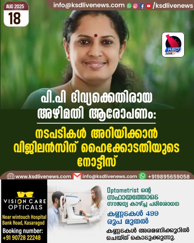 പി.പി ദിവ്യക്കെതിരായ അഴിമതി ആരോപണം: നടപടികള് അറിയിക്കാൻ വിജിലൻസിന് ഹൈക്കോടതിയുടെ നോട്ടീസ്