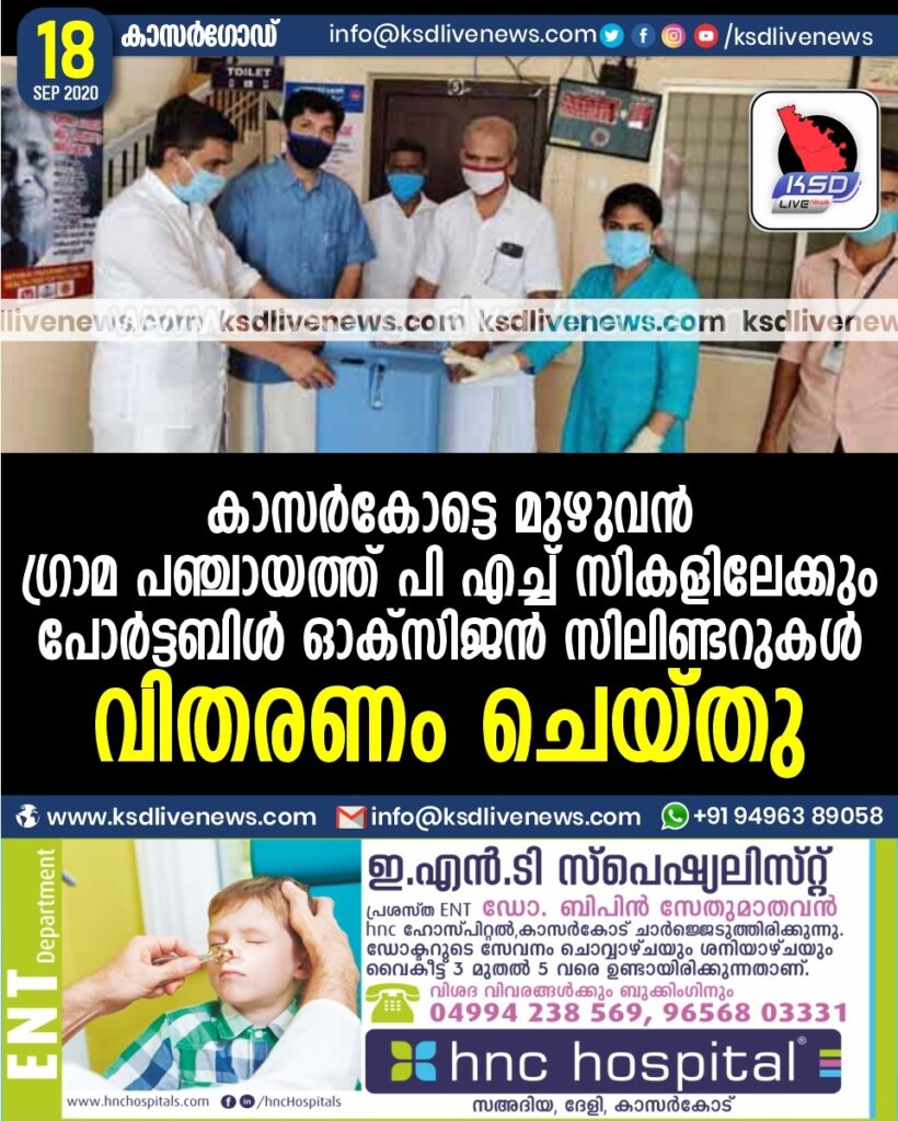 കാസർകോട്ടെ മുഴുവൻ ഗ്രാമ പഞ്ചായത്ത് പി എച്ച് സികളിലേക്കും പോർട്ടബിൾ ഓക്സിജൻ സിലിണ്ടറുകൾ വിതരണം ചെയ്തു