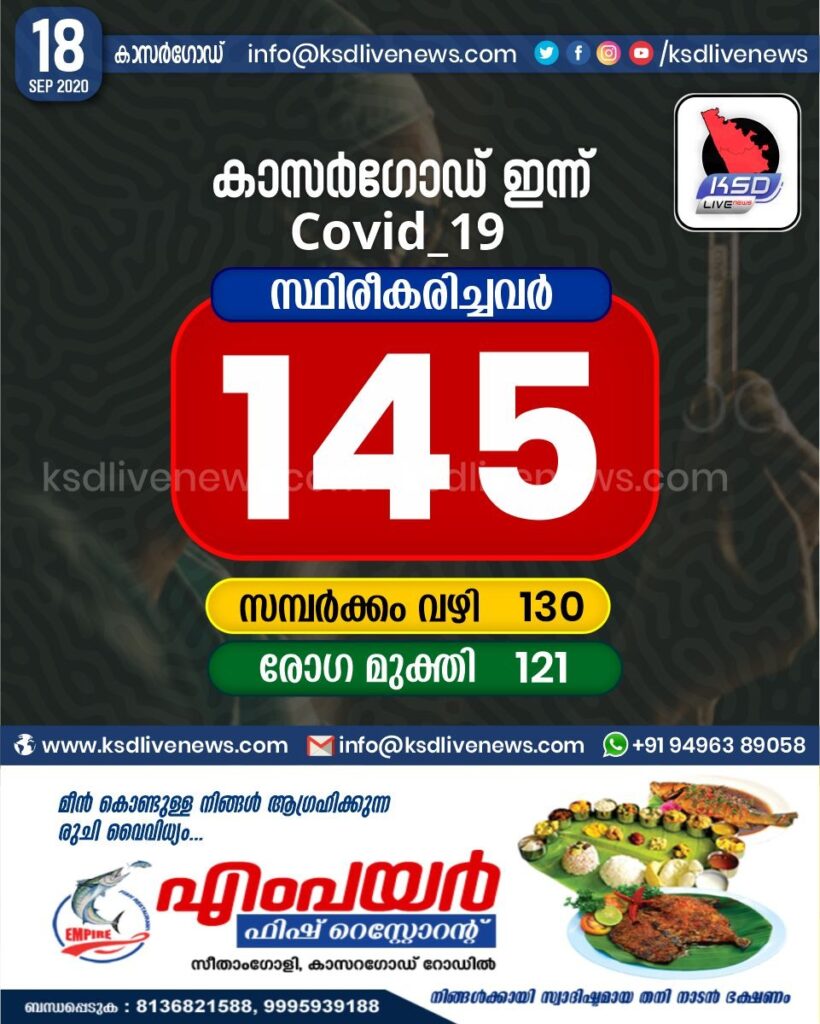 കാസർഗോഡ് ജില്ലയിൽ ഇന്ന് 145 പേർക്ക് കോവിഡ് സ്ഥിരീകരിച്ചു. സമ്പർക്കം വഴി 130 പേർക്കും. 121 പേർക്ക് രോഗ മുക്തി