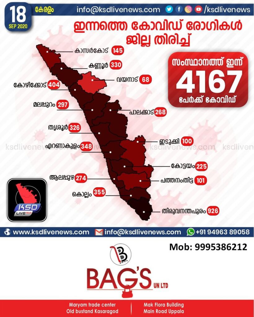 സംസ്ഥാനത്ത് ഇന്ന് 4167 പേര്ക്ക് കോവിഡ്-19 സ്ഥിരീകരിച്ചു. തിരുവനന്തപുരം 926, കോഴിക്കോട് 404, കൊല്ലം 355, എറണാകുളം 348, കണ്ണൂര് 330, തൃശൂര് 326, മലപ്പുറം 297, ആലപ്പുഴ 274, പാലക്കാട് 268, കോട്ടയം 225, കാസര്ഗോഡ് 145, പത്തനംതിട്ട 101, ഇടുക്കി 100, വയനാട് 68 എന്നിങ്ങനേയാണ് ജില്ലകളില് ഇന്ന് രോഗ ബാധ സ്ഥിരീകരിച്ചത്.
