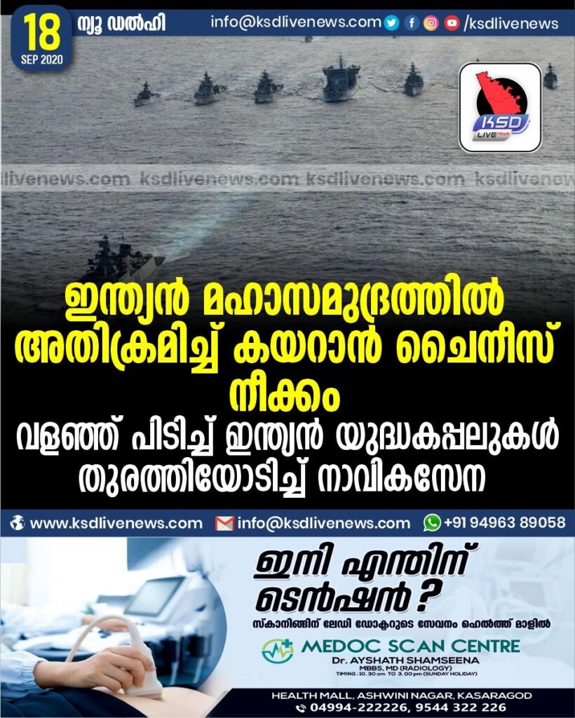 ന്യൂഡല്‍ഹി : ലഡാക്കില്‍ സംഘര്‍ഷം തുടരുന്നതിനിടെ ഇന്ത്യന്‍ മഹാസമുദ്രത്തില്‍ അതിക്രമിച്ച്‌ കയറാന്‍ ചൈനീസ് നീക്കം. ഇന്ത്യന്‍ സമുദ്രാര്‍ത്തി ഭേദിച്ച ചൈനീസ് ഗവേഷണ കപ്പലിനെ നാവികസേന തുരത്തി.
