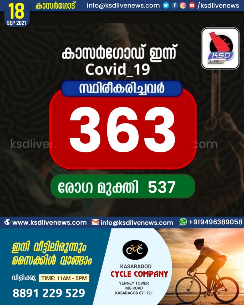 കാസർകോട് ജില്ലയിൽ 363 പേർക്ക് കൂടി കോവിഡ്,538 പേർക്ക് രോഗമുക്തി