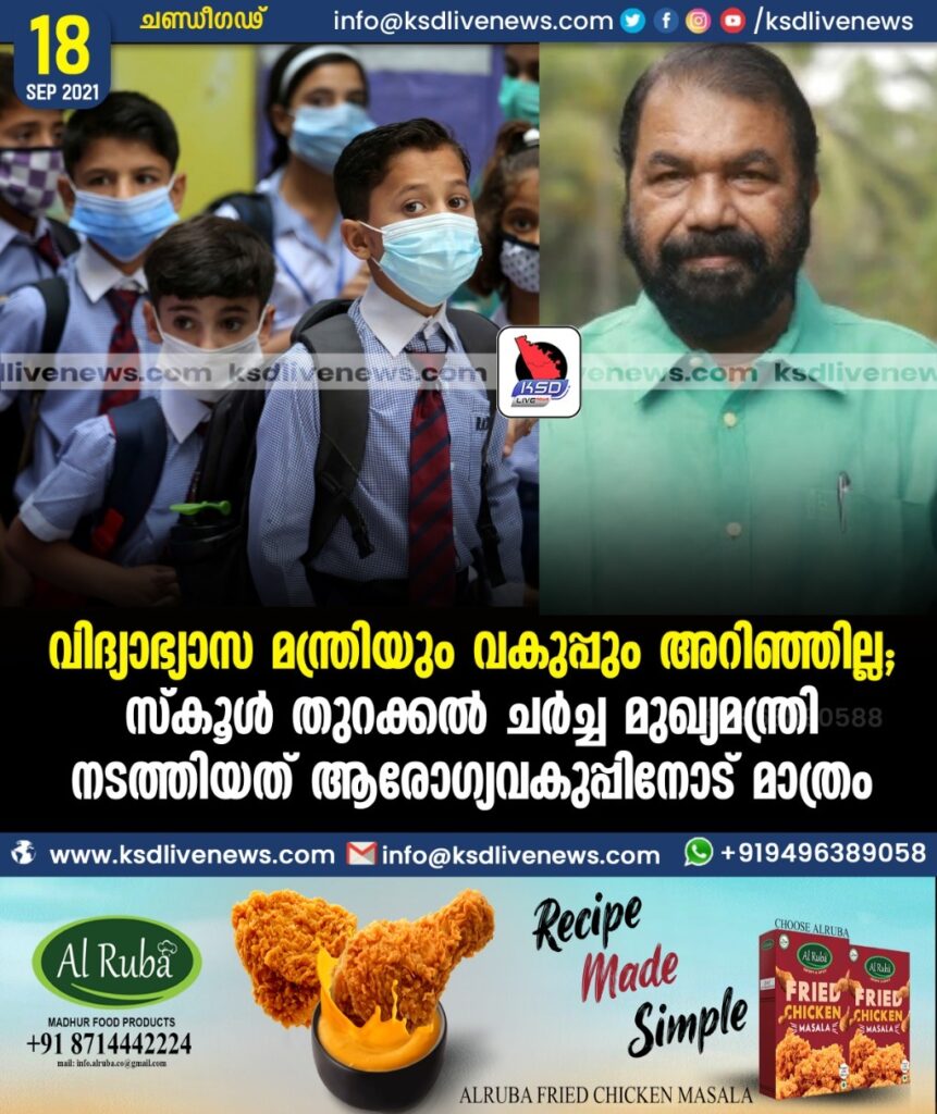 വിദ്യാഭ്യാസ മന്ത്രിയും വകുപ്പും അറിഞ്ഞില്ല:സ്കൂൾ തുറക്കൽ ചർച്ച മുഖ്യമന്ത്രി നടത്തിയത് ആരോഗ്യവകുപ്പിനോട് മാത്രം