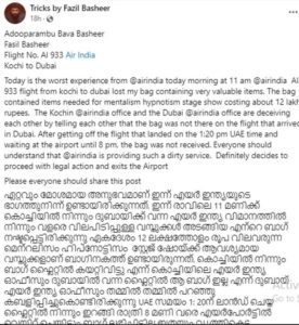 ഏറ്റവും മോശമായ അനുഭവമാണ് ഇന്ന് എയര്‍ ഇന്ത്യയുടെ ഭാഗത്തുനിന്ന് ഉണ്ടായിരിക്കുന്നത്, ഇന്ന് രാവിലെ 11 മണിക്ക് കൊച്ചിയില്‍ നിന്നും ദുബായിക്ക് വന്ന എയര്‍ ഇന്ത്യ വിമാനത്തില്‍ നിന്നും വളരെ വിലപിടിപ്പുള്ള വസ്തുക്കള്‍ അടങ്ങിയ എന്റെ ബാഗ് നഷ്ടപ്പെട്ടിരിക്കുന്നു ഏകദേശം 12 ലക്ഷത്തോളം രൂപ വിലവരുന്ന മെന്റലിസം ഹിപ്നോട്ടിസം സ്റ്റേജ് ഷോയ്ക്ക് ആവശ്യമായ വസ്തുക്കളാണ് ബാഗിനകത്ത് ഉണ്ടായിരുന്നത്, കൊച്ചിയില്‍ നിന്നും ബാഗ് ഫ്ലൈറ്റില്‍ കയറ്റിവിട്ടു എന്ന് കൊച്ചിയിലെ എയര്‍ ഇന്ത്യ ഓഫീസും ദുബായില്‍ വന്ന ഫ്ലൈറ്റില്‍ ആ ബാഗ് ഇല്ല എന്ന് ദുബായ് എയര്‍ ഇന്ത്യ ഓഫീസും തമ്മില്‍ തമ്മില്‍ പറഞ്ഞു കബളിപ്പിച്ചുകൊണ്ടിരിക്കുന്നു UAE സമയം 1: 20ന് ലാൻഡ് ചെയ്ത ഫ്ലൈറ്റില്‍ നിന്നും ഇറങ്ങി രാത്രി 8 മണി വരെ എയര്‍പോര്‍ട്ടില്‍ വെയിറ്റ് ചെയ്തിട്ടും ബാഗ് ലഭിച്ചിട്ടില്ല ഇത്രയും വൃത്തികെട്ട സര്‍വീസാണ് എയര്‍ ഇന്ത്യ നല്‍കുന്നത് എന്ന് എല്ലാവരും മനസ്സിലാക്കുക. തീര്‍ച്ചയായും നിയമനടപടികളുമായി മുന്നോട്ട് പോകാൻ തീരുമാനിച്ച്‌ എയര്‍പോര്‍ട്ടില്‍ നിന്നും പുറത്തേക്കിറങ്ങുന്നു
