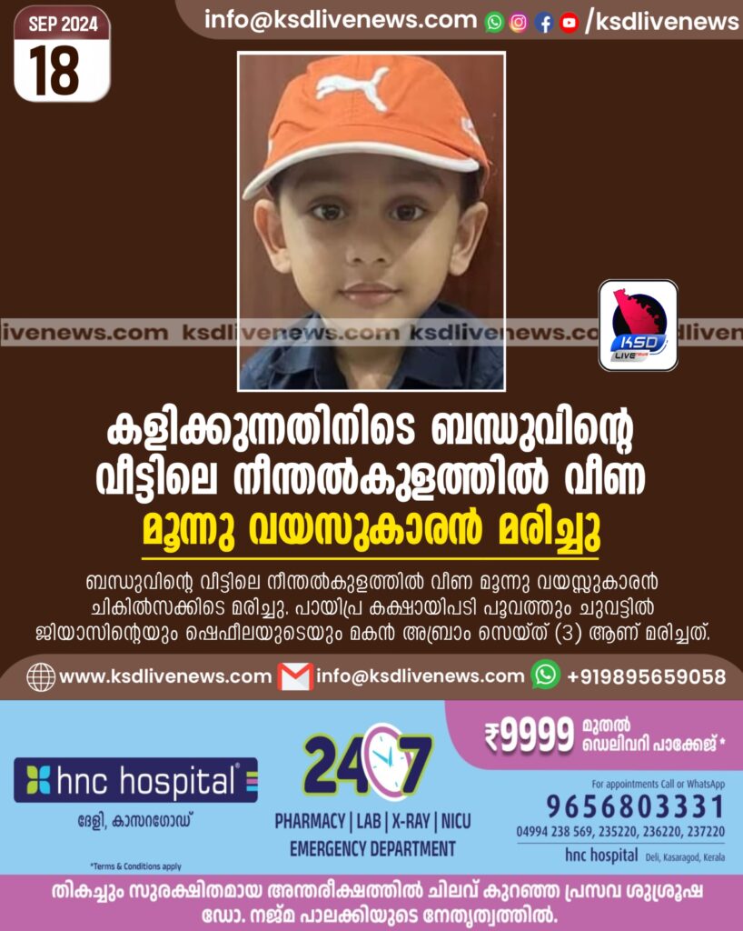 കളിക്കുന്നതിനിടെ ബന്ധുവിന്റെ വീട്ടിലെ നീന്തല്കുളത്തില് വീണ മൂന്നു വയസുകാരന് മരിച്ചു