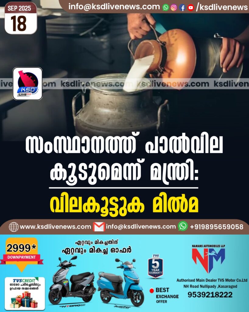 സംസ്ഥാനത്ത് പാല്വില കൂടുമെന്ന് മന്ത്രി: വിലകൂട്ടുക മിൽമ