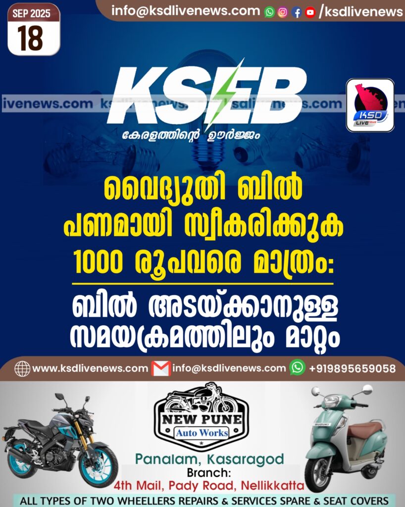 വൈദ്യുതി ബിൽ പണമായി സ്വീകരിക്കുക 1000 രൂപവരെ മാത്രം; ബിൽ അടയ്ക്കാനുള്ള സമയക്രമത്തിലും മാറ്റം